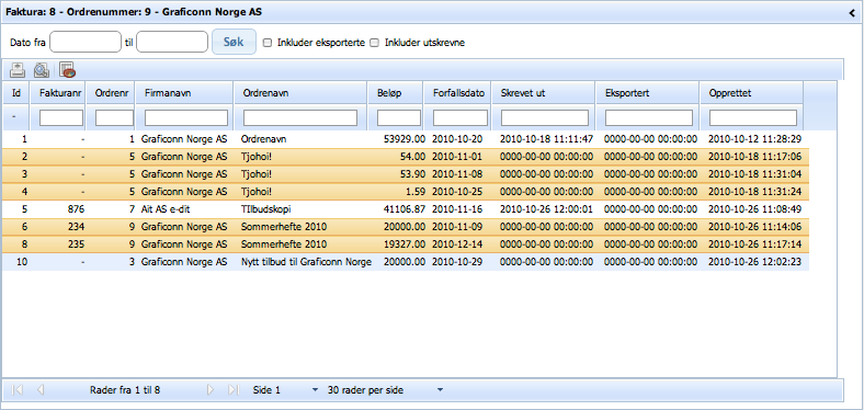 Søkefeltet over tabellen lar deg søke i omfang på dato opprettet. Det søkes i utgangspunktet kun blant fakturaer som verken er skrevet ut eller eksportert. For å inkludere også allerede utskrevne eller eksporterte fakturaer, sett kryss for dette, og klikk «søk».