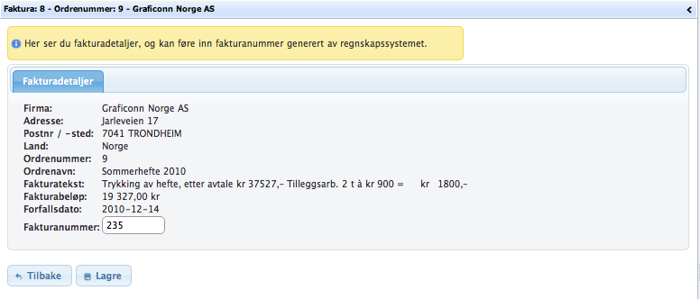 Når faktura er sendt, må fakturanummeret legges inn på fakturaen. Dobbeltklikk på en rad for å legge inn dette i feltet «fakturanummer».