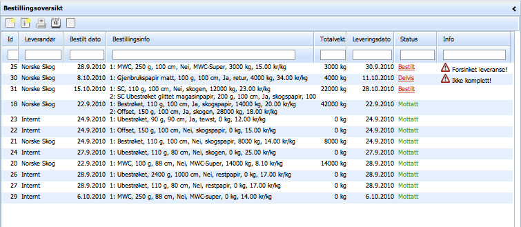 - Info – Dersom ønsket leveringsdato er overskredet uten at bestilling er mottatt vil Info-kolonnen vise varselteksten «Forsinket leveranse!». Dersom kun en del av ordren er blitt registrert mottatt, vil kolonnen vise varselteksten «Ikke komplett!».