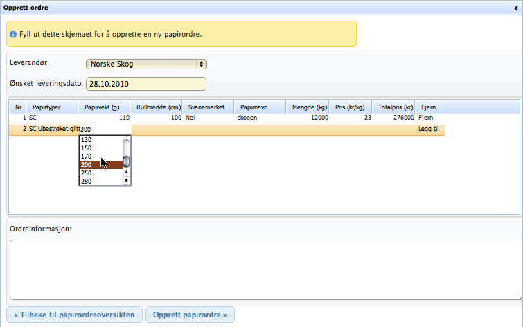 Angi først hvilken leverandør papiret skal bestilles fra. Tilgjengelige leverandører settes opp på siden «Leverandører». Når leverandør er valgt, legges automatisk en rad til i tabellen under.