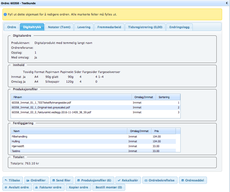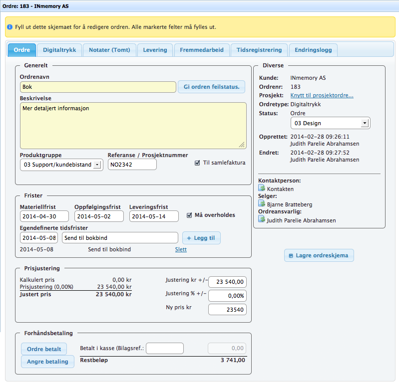 Ordre | Digitaltrykk | Notater | Kalkyler | Levering | Fremmedarbeid | Tidsregistrering | Endringslogg