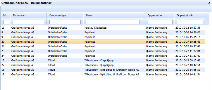 I doumentarkivet legges alle automatiske og brukerinitierte dokumenter. For eksempel ordrebekreftelser, tilbudsbrev, fakturaer og fakturavedlegg.