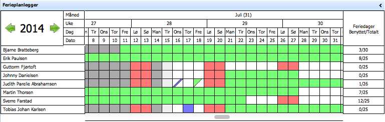 I kolonnen helt til høyre vises totalt antall feriedager som er tatt ut i forhold til antall tilgjengelige feriedager. Ved navigering til tidligere år vil kolonnen kun vise hvor mange feriedager som ble tatt ut det året.