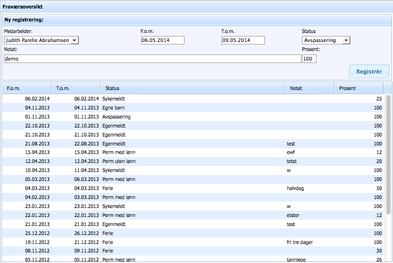 Sett fra-/til-dato og status sammen med et notat (ikke påkrevd) og prosent, og klikk «Registrer» for å legge til nytt fravær. For å angi fravær bare deler av dagen, må du regne ut prosenten av det fraværet i forhold til det som er angitt som timevilkår denne dagen (vanligvis 8 timer).