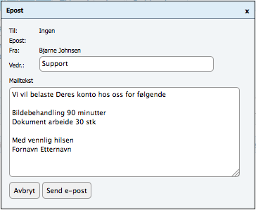 For å sende informasjon til kunden om utført ordre og informasjon om tid som vil bli fakturert, klikk «Send e-post til kontaktperson». Dette åpner et lite vindu med informasjon fra prosesskodene valgt på ordren og avsender med navn til innlogget bruker.