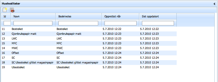 Det er denne listen over huskvaliteter som ligger til grunn alle steder i systemet hvor det velges papir. Både på kalkyle og ved papirbestillinger.