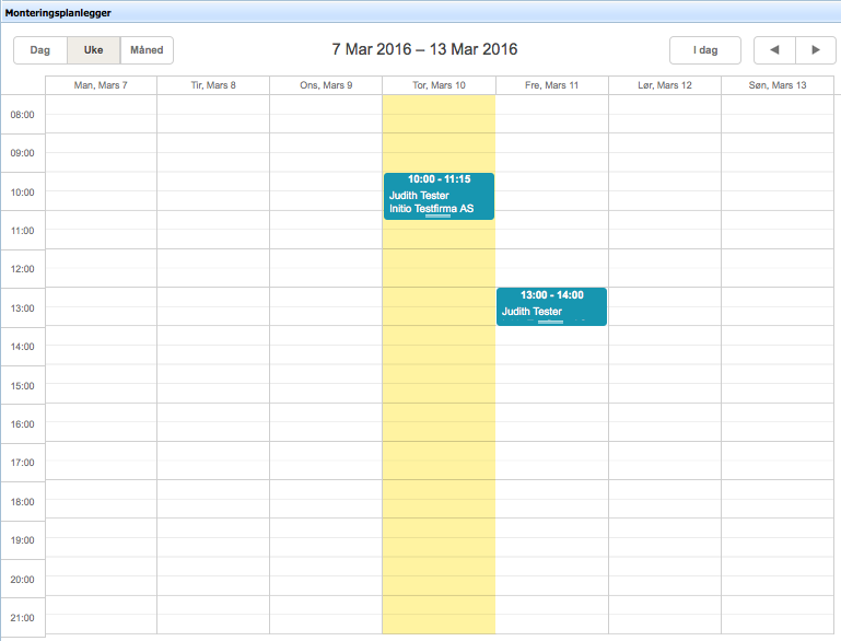 Montøeringsplanleggeren viser en kalenderoversikt over alle avtaler på tvers av ordrer og medarbeidere. Som standard åpnes kalenderen i ukevisning, men oppe til venstre kan dette endres tli å vide én dag eller hele måneden.