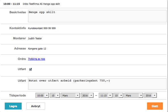 Når et oppdrag er utført kan montøren gå inn på avtalen og merke den aom «utført», og eventuelt legge til en kommentar. Denne informasjonen vil også bli tilgjengelig på ordren.