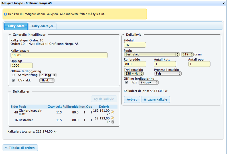 Når kalkylen er opprettet kan du når som helst redigere den og rekalkulere prisen ved å klikke