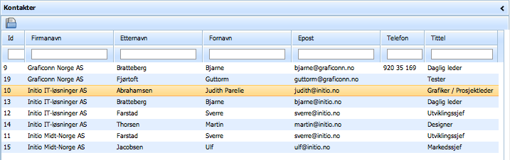 Kontakter lister opp alle kontaktpersoner som er registrert i OnTop. Dersom du valgte