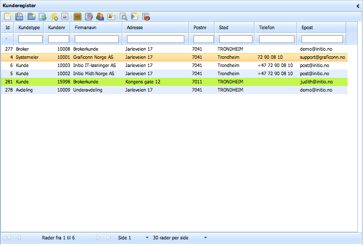 En kunde som er opprettet av en broker vil være markert i kundelista med grønn bakgrunn. Dermed er det lett å skille mellom systemeiers kunde og brokerens kunde dersom de har felles kunde.