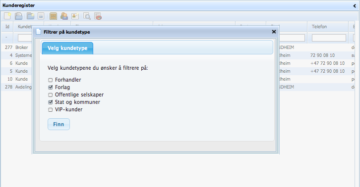 Sett kryss ved kundetypene som skal med, og klikk «Finn» for å filtrere registreret etter disse spesifikasjonene. Print og excel-eksport vil vise kun det filtrerte utvalget.