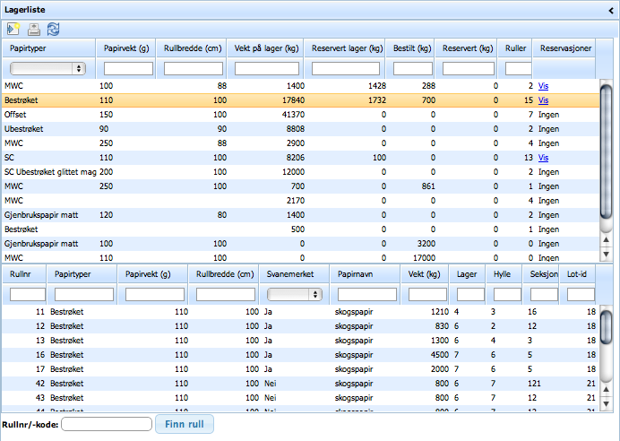 Den øverste tabellen er lagerlinjeoversikten. Denne viser alle papirtyper som er på lager basert på navn, gramvekt og rullbredde. Ved å markere en ilnje i denne tabellen, oppdateres den nederste tabellen til å vise alle rullene som er på lager av den aktuelle papirtypen. Lagerlinjeoversikten har følgende kolonner: