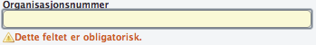 Alle felter som er merket med gul bakgrunn må fylles ut. Dersom du ikke har fyllt ut alle de obligatoriske feltene, vil du få en advarsel om dette. Det blir også angitt grafisk hvilke felter som ikke er tilstrekkelig utfylt: