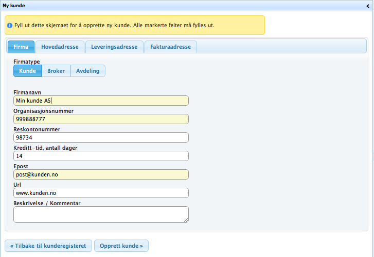 Opprette ny kunde