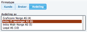 En kunde kan settes til å være avdeling av en annen kunde i systemet. Dette for å forenkle statistikkmulighetene og liknende mot kunder som har flere bestillings- og leveringspunkter. Når du velger avdeling på en ny kunde får du opp en liste over alle eksisterende kunder. Velg en kunde i lista for å knytte det nye firmaet opp som avdeling mot den valgte kunden.