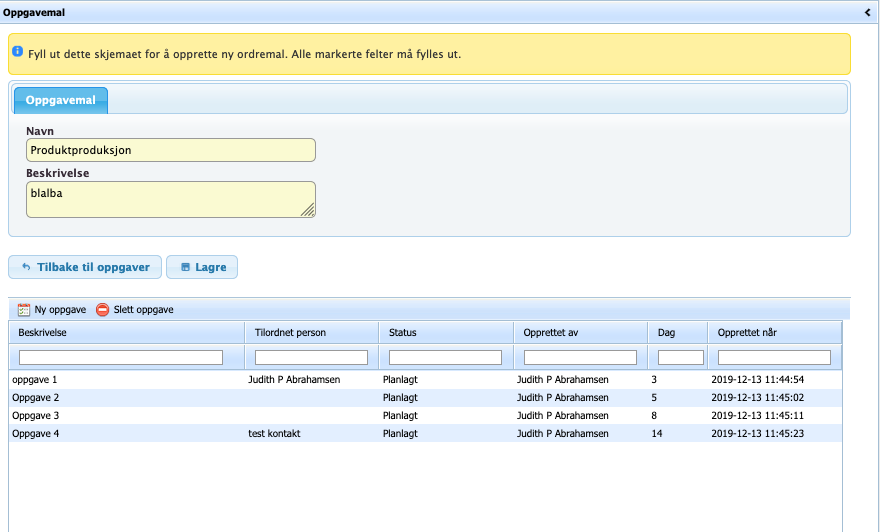 Opprett først en ny mal med navn og beskrivelse. Når den er opprettet, dukker det opp en tabell med tilhørende oppgaver.