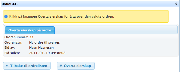 Her finnes informasjon om hvem som åpnet ordren, og når dette ble gjort. Hvis det har gått kort tid siden dette tidspunktet, kan det være lurt å drøye litt før du overtar eierskap.
