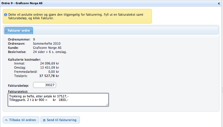 Når alt er på plass, klikk «Send til fakturering» for å legge ordren til i faktureringskøen for godkjenning.