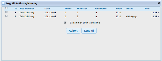 Velg hvilke linjer som skal med, og om de skal inn som flere fakturalinje eller én samlet linje.