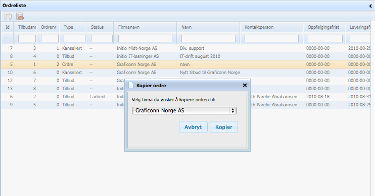 For å kopiere en eksisterende ordre eller tilbud, marker ordren i lista og klikk