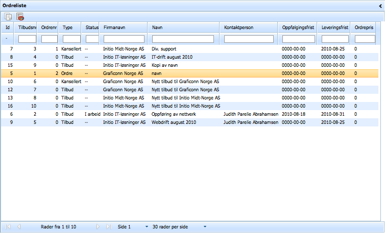Ordrelisten viser alle tilbud og ordrer i systemet. Alle ordrer begynner som tilbud og endres eventuelt til en ordre når tilbudet aksepteres. Tilbud og order har separate nummerserier.