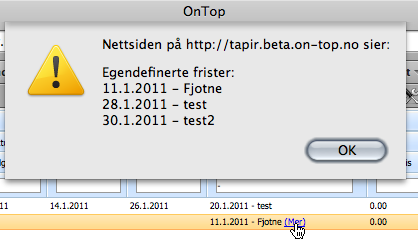 En ordre kan ha et utall egendefinerte tidsfrister. Som standard vises kun den første av disse i ordrelista. Dersom en ordre har flere enn én tidsfrist, vil det legges til en link, «Mer», bak tidsfristen som vises. Klikk «Mer» for å liste alle fristene på denne ordren. Tidsfristene vises i en popup-boks: