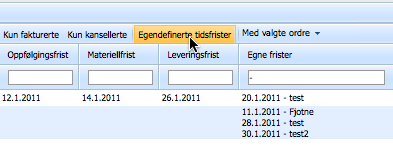 For å vise alle tidsfristene på alle ordrer, klikk «Egendefinerte tidsfrister» over tabellen. Linjene med de aktuelle ordrene vil da utvide seg, og vise alle tidsfristene: