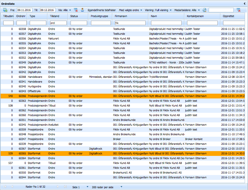 Ordrelisten viser alle tilbud og ordrer i systemet. Tilbud og ordrer har separate nummerserier.