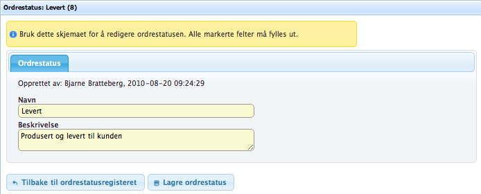 Når du redigerer en ordrestatus får du alltid informasjon om hvem som opprettet statusen, og når det ble gjort. Dersom ordrestatus har blitt redigert etter opprettelsen, vil det også stå informasjon om hvem som redigerte den og når.