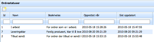 En ordre kan ha en status. Ordrens status vises i en kolonne i ordrelista. Tilgjengelige statuser settes opp av systemeier under «Ordrestatuser».