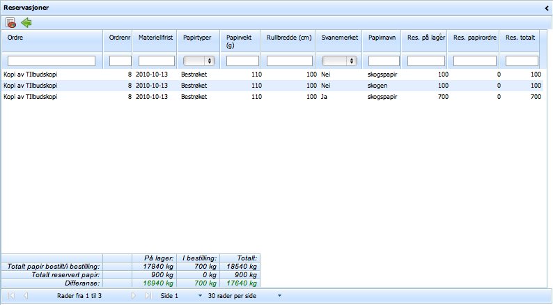 Under tabellen vises total oversikt over papir på lager og i bestilling, og hvor mye av dette som er reservert. Dersom totalsummen innebærer mer pair på lager enn i bestilling, vises tallene med grønn farge. Dersom det er mer papir reservert enn på lager og i bestilling vises summen med rød farge.