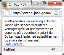 Når printtjenesten på printserveren ikke svarer kan dette skyldes mange ting. Det kan være at webserveren er nede, at serveren har kræsjet, at nettet er nede eller at serveren rett og slett er slått av. Etter at du har valgt utskrift, vil systemet prøve å skrive ut i ca. 30 sekunder, og så oppdage at printserveren ikke svarer. Du vil da få opp en dialog som angir at printserveren ikke svarte. I denne dialogen kan man velge å laste ned pdf-filen som kan benyttes for å manuelt skrive ut etikettlappene.