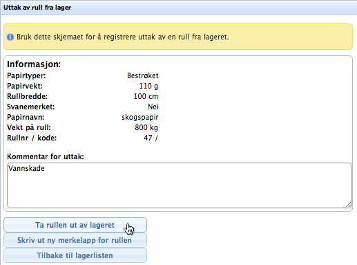 Før en rull kan tas ut må det fylles ut en kommentar for uttaket. når kommentarfelt er utfylt, klikk «Ta rullen ut av lageret».