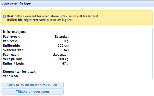 Ved å dobbeltklikke på en rull i rulloversikten, eller ved å søke etter en bestemt rull i lagerlista, kommer du til siden for uttak av rull fra lager.