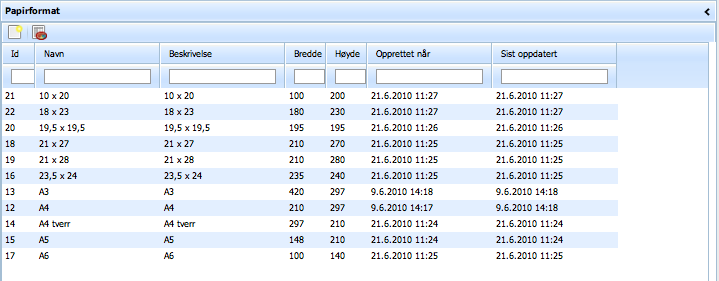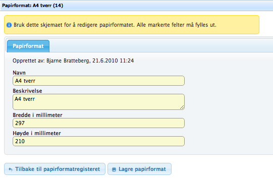 Et papirformat består av et navn, en beskrivelse og papirets bredde- og høydeformat i millimeter. Alle feltene må fylles ut.