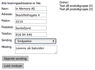 Når flere ordrer markeres samtidig, angis disse som «samsending», og alle disse ordrene vil få samme sendingsnummer. Consignor-vinduiet vil sjekke første levering på de markerte ordrene, at de er identiske, og vil gi en advarsel dersom de ikke er det. Fraktprisen beregnes ut fra sendingstype og priser/rababatter som er angitt i Samsendingspriser under System.