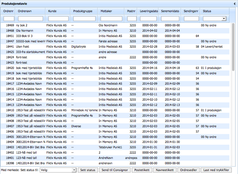 Når en ordre skal videre i produksjonslinja, må ny status settes. Marker én eller flere ordrer, velg ny status i lista under tabellen, og klikk «sett status».