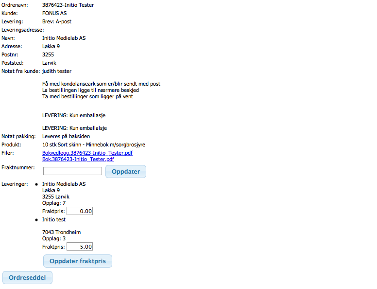 Dobbeltklikk på en linje i tabellen for å vise detaljert info om denne ordren, laste ned ordreseddel og eventuelle tilknyttede filer, samt definere fraktnummer og fraktpris manuelt.