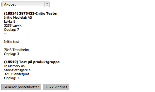 Velg sendingsalternativ og klikk «Generer postetiketter». Dette genererer en PDF med postetiketter til de angitte adressene. Fraktpris beregnes på hver levering basert på sendingstype, opplag (hvis sendingstype er A-post eller småpakke) og priser/rabatter angitt i Samsendingspriser under System.