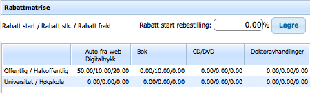 Fraktrabatten beregnes i forbindelse med sending fra produksjonstavla. Dersom det er lagt in støtte for å ta i mot rebestillinger, og innkomne ordrer er merket som opptrykksbestilling, vil rabatten som er angitt i «rabatt start rebestilling» legges på startprisen før eventuelle andre rabatter.