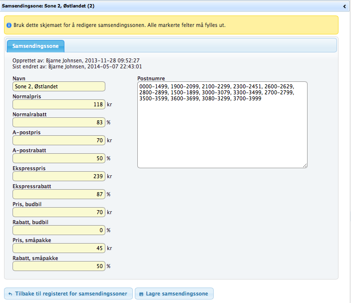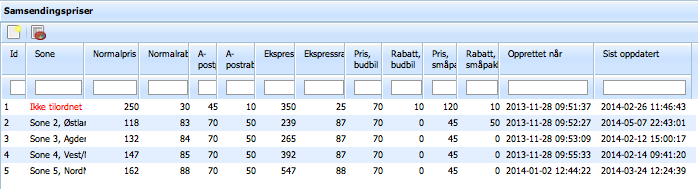 For sending av handelsvareordrer via produksjonstavlen, kan det her settes opp et prisoppsett basert på ulike postnumre og sendingsmetoder.