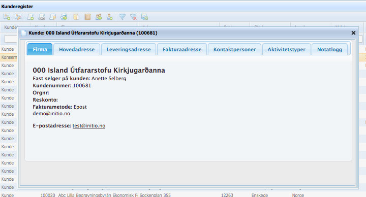 Dersom du dobbeltklikker på en kunde i kunderegisteret, får du opp informasjon om denne kunden i et modalvindu.