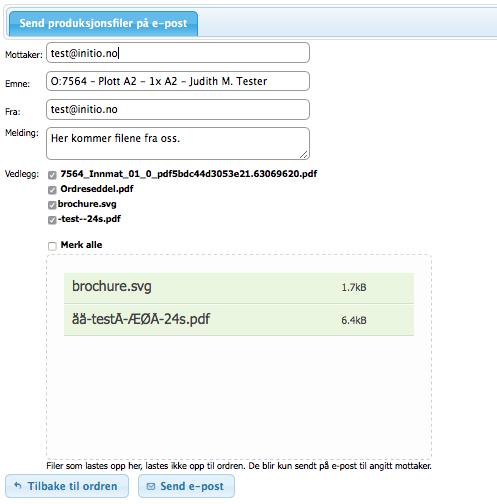 Dersom du trenger å sende én eller flere produksjonsfiler som ikke skal gå som fremmedordre, klikk knappen «Send filer» inne på ordren. Fyll ut mottakers e-post, og eventuell melding. Emnet på e-posten vil automatisk fylles ut med ordrens navn, men dette kan redigeres. Under kan du sette kryss ved de filene fra produksjonsarkivet som skal følge med e-posten.