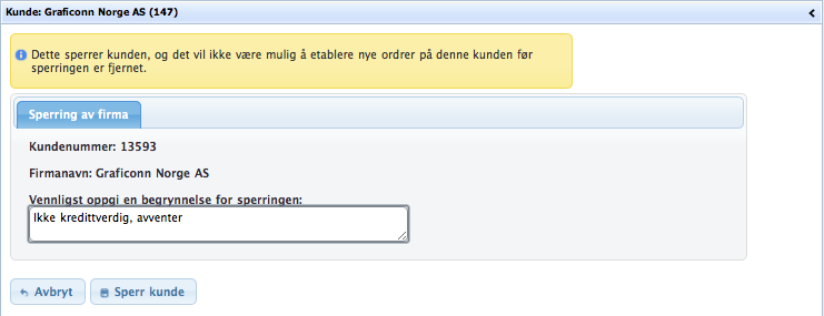 En kunde i kunderegistreret kan sperres. Når en kunde er sperret, er det ikke mulig å opprette nye ordrer på denne kunden.