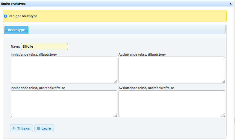 For hver brukstype er det mulig å angi faste tekster for tilbudsbrev og ordrebekreftelse. Dersom ingenting er fylt ut her, brukes standardtekstene fra Systeminnstillinger.