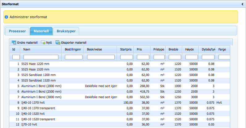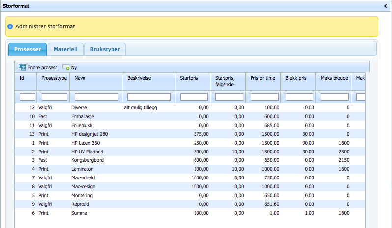 For å kunne ta i bruk kalkylen på ordretypen Storformat, så må det først opprettes prosesser, materiell og brukstyper.