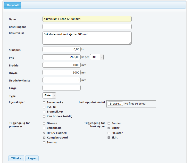 - Bredde/høyde – for å ikke komplisere utskytingen for mye er det lagt inn en begrensning på høyde/bredde-format på materiell. Høyde må alltid settes til den største verdien. Dersom du skriver inn en høyere verdi på bredde enn på høyde, vil du få et varsel og systemet vil bytte om på verdiene automatisk.