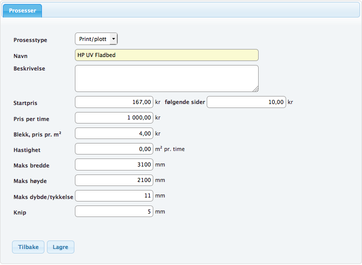 Maks bredde/høyde – Definer hva som er maks materialformat som prosessen/maskina kan håndtere. Dette vil påvirke både hvilke materialer som kan velges og hvordan utskyting beregnes.