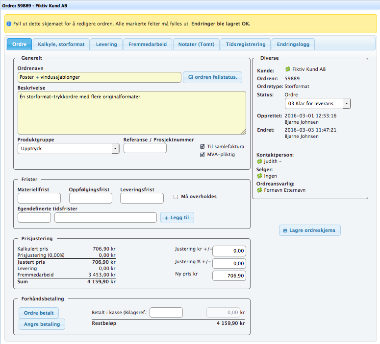 Til venstre summeres alle ordrens detaljpriser opp, kalkyle, levering, fremmesarbeid og eventuelle justeringer. Det er denne summen som vil komme på fakturaen om ingenting endres.